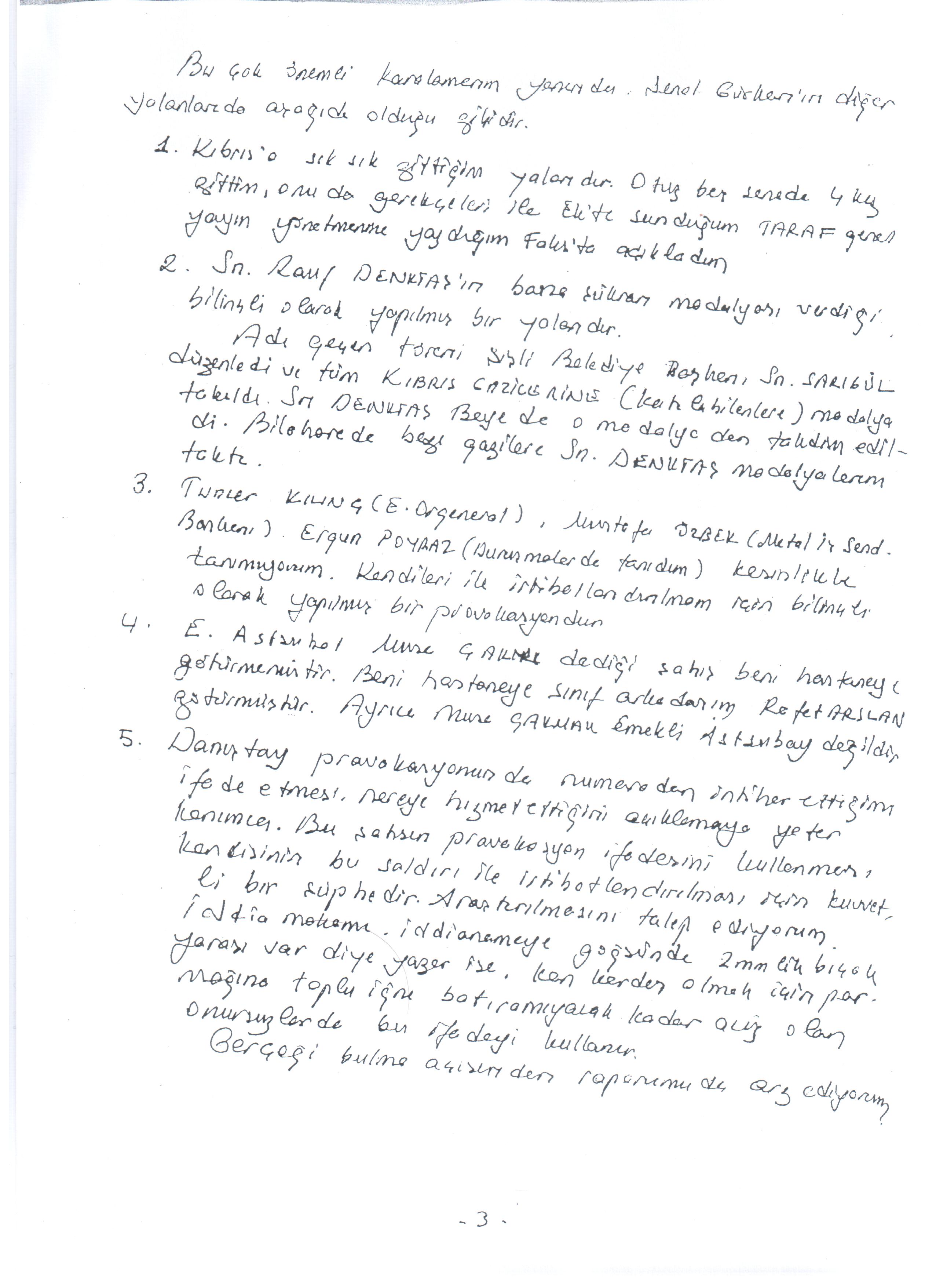 Savunma amaçlı sunum ve taleplerimde, kovuşturma süreci ve öncesi benim şeref ve onuruma ahlaksızca saldıranlara hiçbir hukuki yaptırım uygulanmadığı için ben bireysel mücadelemi veriyorum. Bu ajan provokatörler hakkındaki tespitlerimde hiç yanılmadığım bugün net olarak ortaya çıkmıştır!